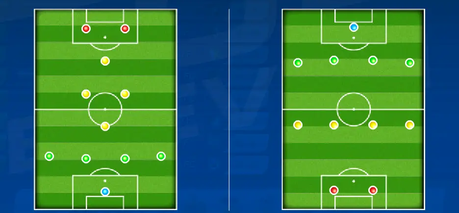 - Hạn chế: Khi đối mặt với đội hình có 3 hoặc 5 tiền vệ (ví dụ: 4-3-3 hoặc 3-5-2), các cầu thủ ở trung tâm trong đội hình 4-4-2 có thể đông hơn các cầu thủ ở trung tâm.